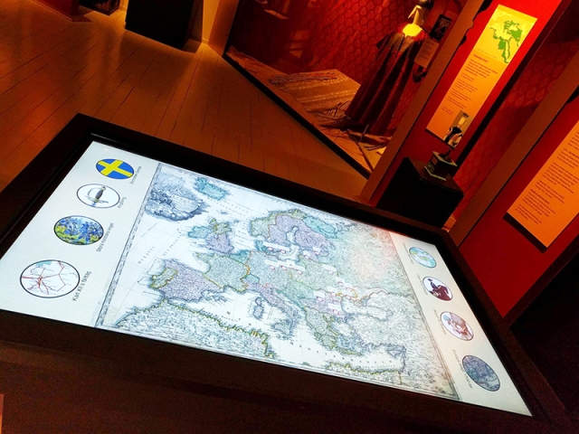 On the multitouch table, an interactive map presents an exhibition about King Charles's creditors (lenders) who arrived in Blekinge a winter 1716. They came to get the money back that Charles XII borrowed by them during their time in the Ottoman Empire.